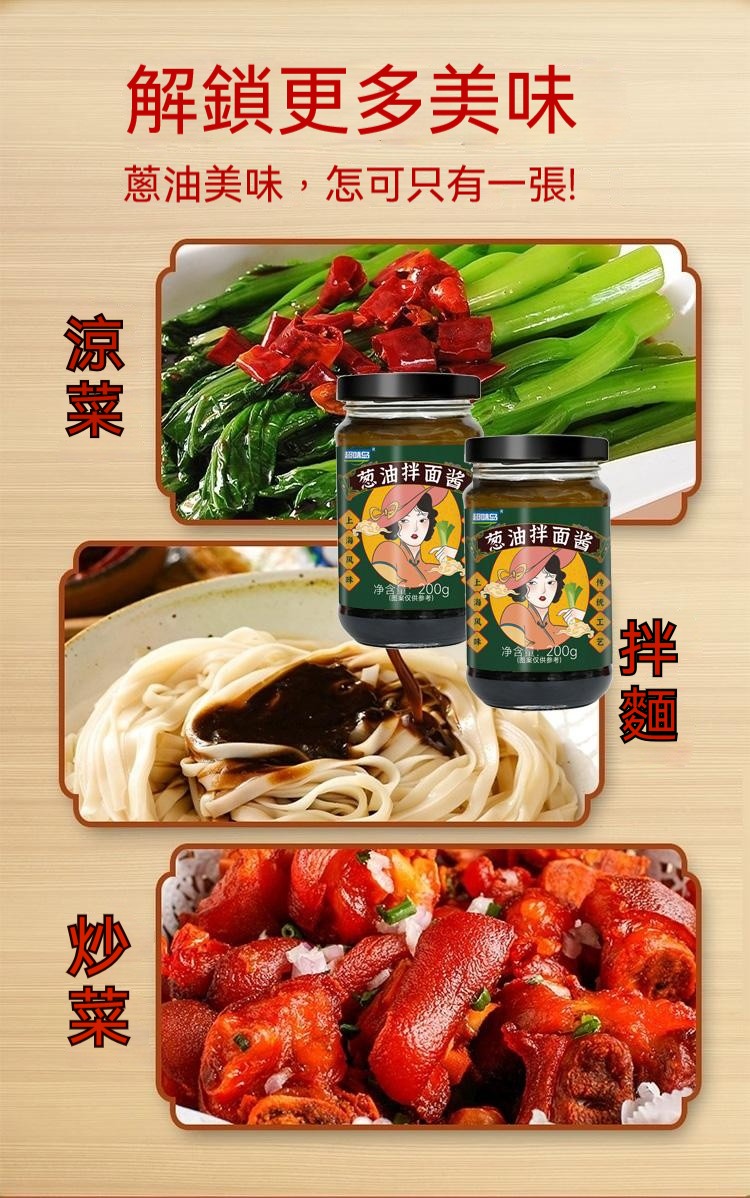 15分鐘前醇厚麵醬,完美搭配麵食,展現獨特風味 ,五分鐘就能吃上的蔥油拌面 ,無需繁瑣步驟 ,開瓶即食 油潤蔥香即刻享用 ,增鮮提香 ,秒變大廚 ,飯或者面都能一勺搞定 - 【98%客戶選擇】4入組-NT$1180